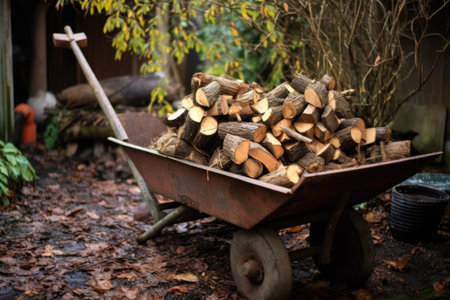 split logs in wheelbarrow near firewood pile, created with generative ai