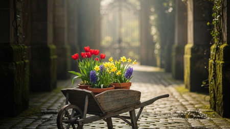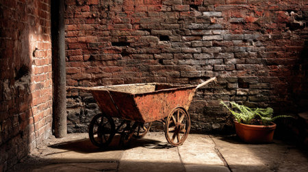 A vintage wheelbarrow rests on a stone floor, illuminated by soft light, creating a warm contrast against the textured brick wall. Ideal for rustic themes.