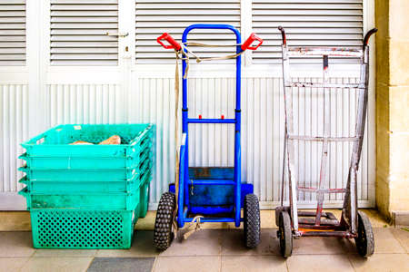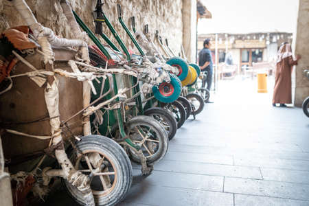 Doha, Qatar - 25 Nov 2016: Row of wheelbarrows waiting for their porter in the early afternoon, with 2 men in the background. Taken in Souq Wakif, Doha