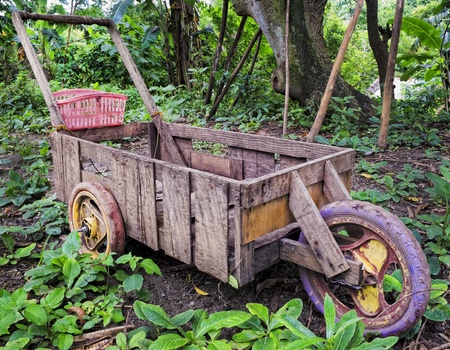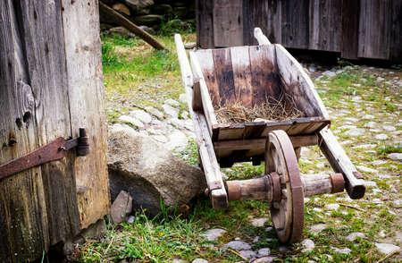 Old village wooden cart to transport grass and wheat. Horse saddle. Village atmosphere