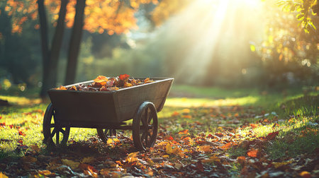 A serene autumn garden scene features a rustic cart filled with colorful leaves, creating a beautiful and tranquil atmosphere perfect for seasonal cleanup and appreciation.