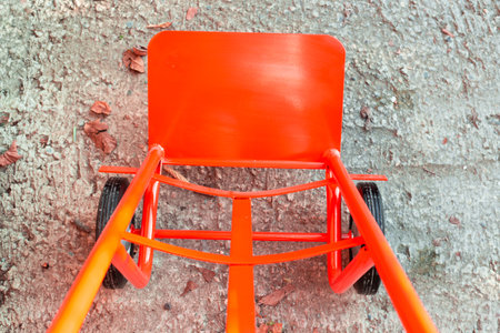 A weathered orange cart sits alone in an empty industrial lot under a dramatic sky. Perfect for conveying themes of abandonment and rustic charm.