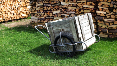 Wood and steel cart with rubber tires, on a green lawn, with piles of stacked chopped firewood in background.