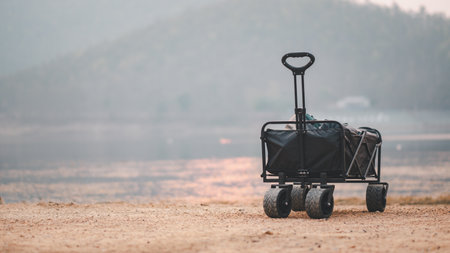 A black utility cart stands alone on a sandy lakeshore, against a backdrop of soft twilight hues.