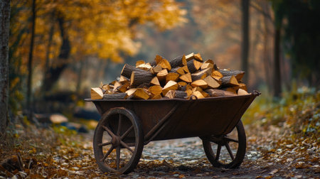 A rustic wheelbarrow brimming with split firewood rests along a forest path, surrounded by the warm hues of autumn leaves, showcasing nature's beauty.