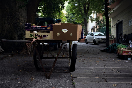 Genoa, Italy - July 2024 - Produce stall with people browsing on a downhill alley bordered by trees