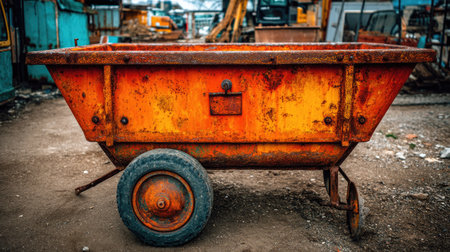 A vintage rusty orange cart sits on a construction site, showcasing a weathered exterior. It captures the essence of industrial work and heavy-duty equipment.