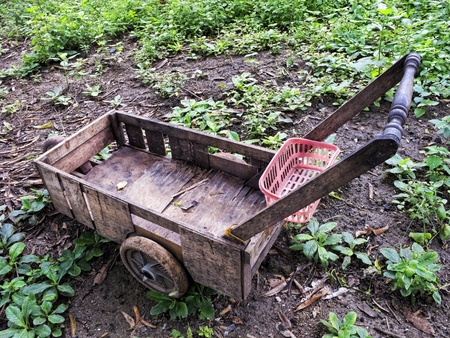 Wooden cart with flowers, plants and soil. Gardening concept.