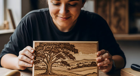 A female artisan smiles with pride and satisfaction as she admires a piece of wood art she has created. The artwork, held in her hands, is a beautiful and detailed engraving of a tree in a rolling landscape. The scene represents the joy of craftsmanship, creativity, and the accomplishment of a finished project.