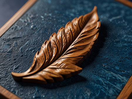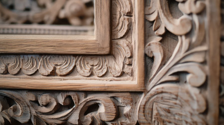 Closeup photo of a decorative wooden frame with intricate floral designs, set against a blurred natural background for a serene feel