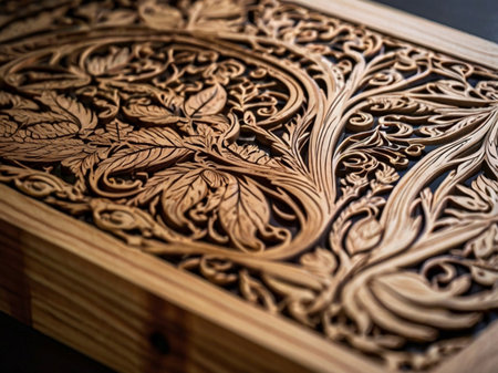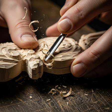 Closeup of hands meticulously carving an intricate floral design on a wooden surface