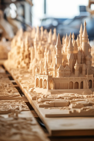 A vibrant workshop filled with intricately carved wooden sculptures, showcasing the creative process of artisans. Various tools and detailed figures create an inspiring artistic atmosphere.