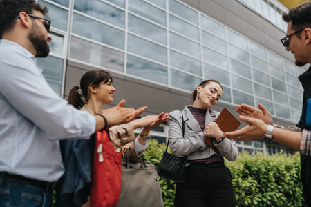 Celebrating success with a small group of applauding business colleagues outdoors