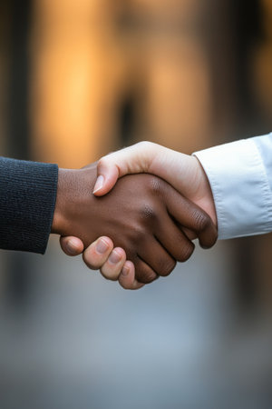Close-up view of two diverse hands engaging in a handshake, symbolizing partnership and friendship in a multicultural environment, representing unity and cooperation.
