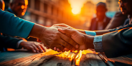 Two hands engage in a warm handshake against a serene sunset backdrop, symbolizing partnership and trust. This image captures the essence of cooperation and connection in a beautiful outdoor setting.