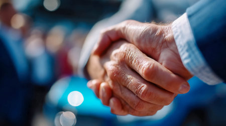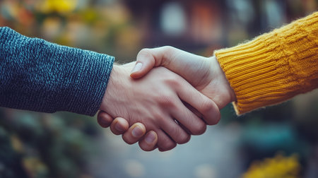 warm handshake between two individuals symbolizes trust and connection in serene outdoor setting. soft focus background enhances emotional depth of this moment.
