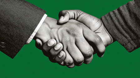A close-up view of two hands engaged in a firm handshake against a vibrant green background, symbolizing unity, collaboration, and professional agreement.