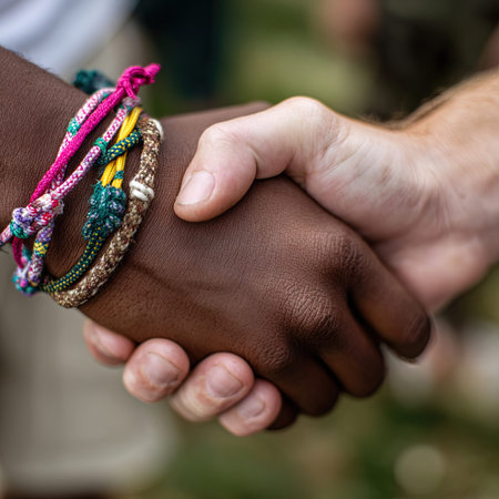 A close up view of two hands engaged in a handshake, symbolizing friendship and mutual understanding. The hands exhibit diverse skin tones and vibrant nail polish colors.