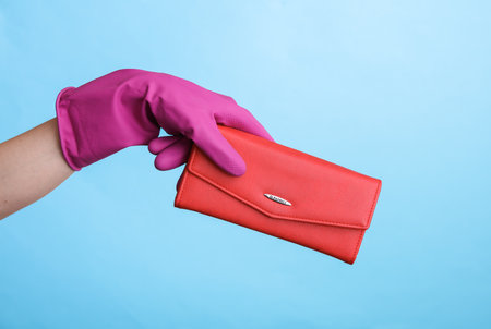 Hand in purple rubber cleaning glove holding purse on blue background. House cleaning and housekeeping concept