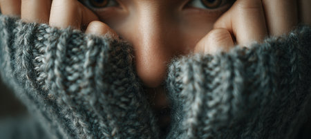 Close-up image of fingers pressing against a face, highlighting the texture of a blurred sweater. The soft lighting and abstract composition evoke emotional symbolism.