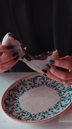 Close-up image of female hands with delicate pink manicure on nails on black background. Hand skin care, manicure and beauty treatments. Elegant and graceful hands with thin graceful fingers
