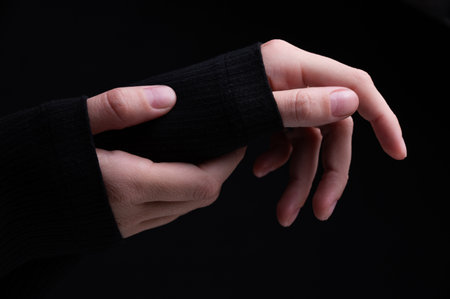 Female hands in black knitted gloves mitts with beautiful manicure - dark blue glittered nails on knitted background with copy space