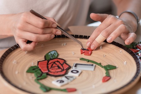 Workplace of a mosaic master: female hands laying out a mosaic element on the table