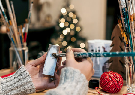 In young female hands there is a brush and a jar of paints. The artist paints a picture with watercolors