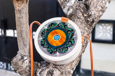 Fashionable stylish rattan bag outside. Tropical island of Bali, Indonesia. Rattan handbag.