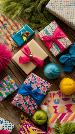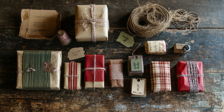 Festively wrapped gift boxes with unique designs, laid out on a rustic wooden table, ready for a special occasion