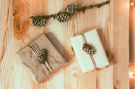 Red and kraft christmas gifts surrounded with pine cones, leaves and twine on a wooden table.