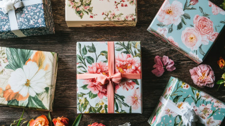 A charming collection of beautifully wrapped gift boxes adorned with floral patterns resting on a rustic wooden surface, perfect for any celebration.