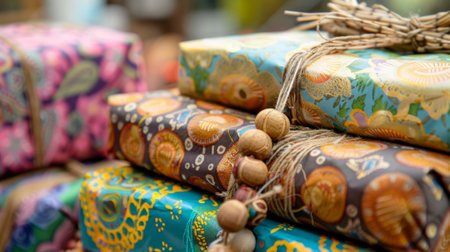 An enchanting display of beautifully wrapped Christmas gifts in intricate patterns, surrounded by natural greenery and decorative ornaments, perfect for seasonal celebrations.