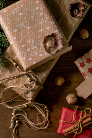 Collection of different Christmas gift boxes in eco-friendly craft paper decorated by natural nuts and cinnamon sticks over wooden background with fir tree branches. Eco xmas gift concept. Flat lay