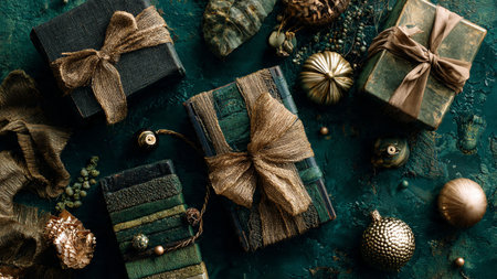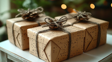 Celebrate the holiday spirit with beautifully wrapped gifts featuring elegant paper and twine on a rustic table adorned with pine branches and pine cones.