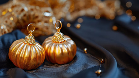 Two exquisite golden pumpkin decorations sit elegantly on rich black fabric, surrounded by twinkling fairy lights, creating a warm and festive ambiance.