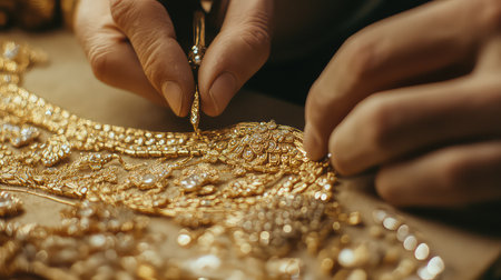 A close-up of skilled hands working on a stunning handcrafted gold design, showcasing intricate patterns and detailing indicative of high-quality artistry.