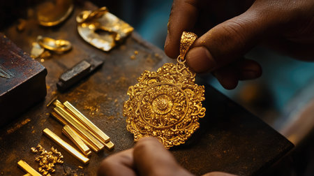 An artisan carefully shapes a stunning gold pendant in a workshop filled with tools and raw materials, showcasing the artistry and craftsmanship involved in jewelry making.