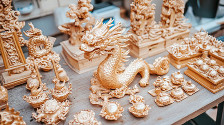 A stunning display of intricately designed golden dragon sculpture along with various decorative artifacts on a wooden table, showcasing fine craftsmanship and artistic beauty.