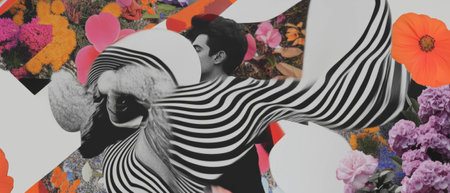 Minimalist collage blending geometric shapes and swirling colors with floral elements