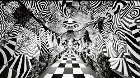 Black and white photo of hallway with checkered floor and trees. Generative AI.