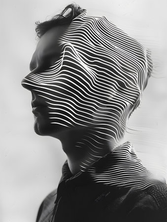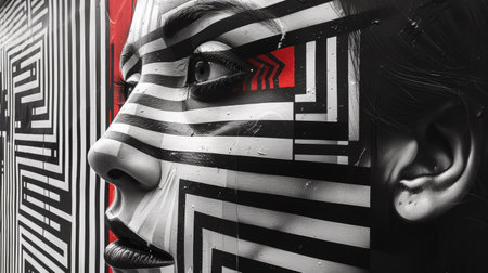 Surreal double exposure of a woman with abstract shapes dividing her face, highlighting contrast and symmetry in monochrome tones, evoking a sense of duality and introspection.
