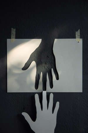 Help, Care, Support or Partnership Concept. Paper Cut as Hands Shape hanging on the wall. look like the top one trying to help the one below. Touching each other
