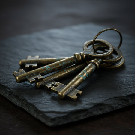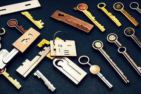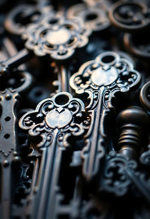 An AI generated illustration of numerous vintage keys of various shapes and sizes on a dark surface