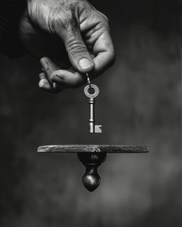 A single hand balances a shiny golden key representing the power of choice and opportunity. Black and white art.