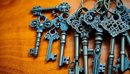 A collection of vintage keys placed on a table. This image can be used to represent concepts such as antique, nostalgia, security, or unlocking mysteries.