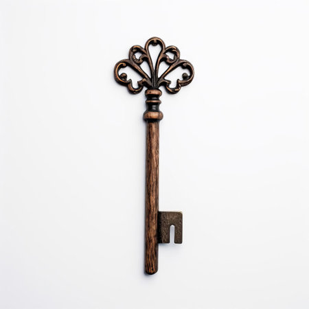 the wooden key, crafted with precision and care, lies elegantly on a pristine white background, showcasing its intricate details and natural wood grain, perfect for home decor, rustic charm, or as a unique gift idea, evoking feelings of nostalgia and simplicity. ai generated