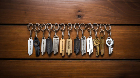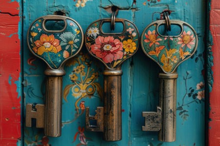ornate keys displayed on rustic wood