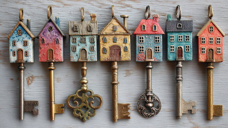 Old keys and small houses on a wooden background. Retro style.