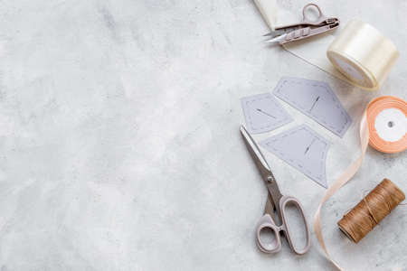 Old sewing accessory flat lay background. Sewing handbook template.